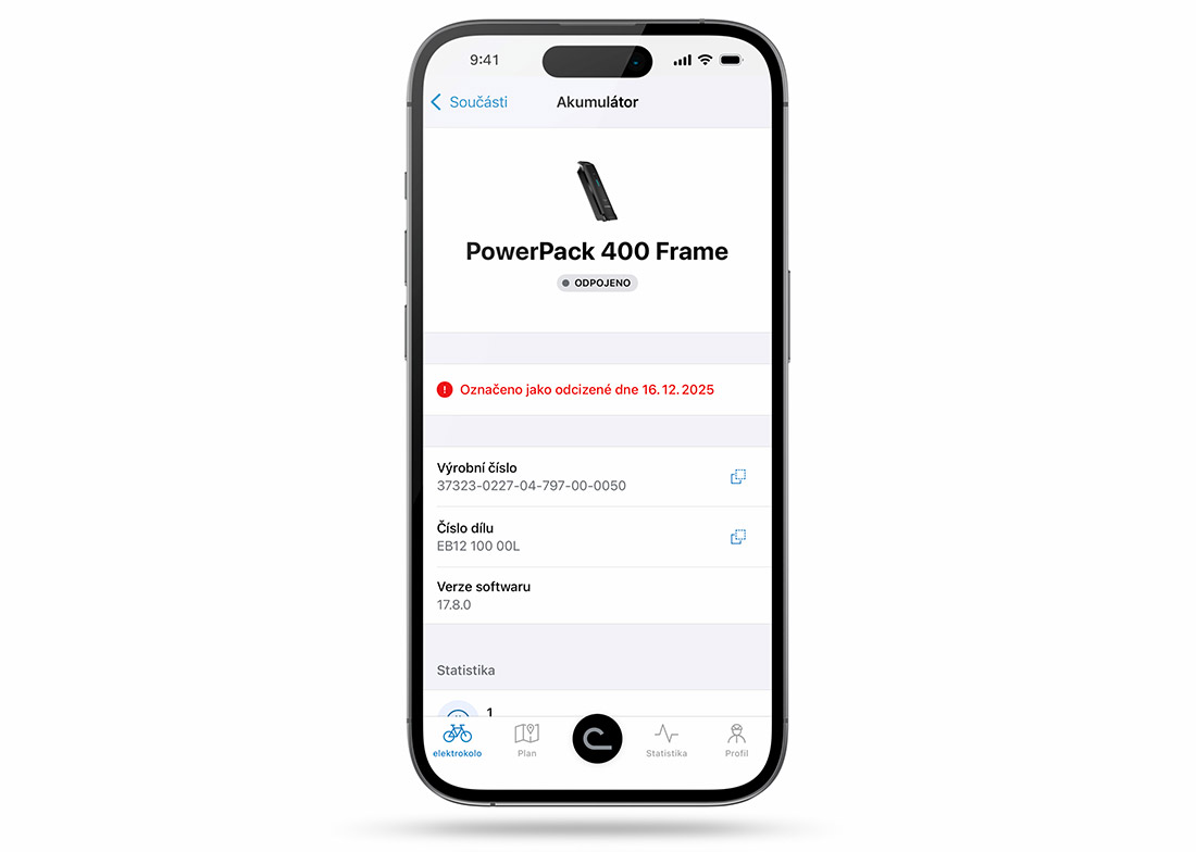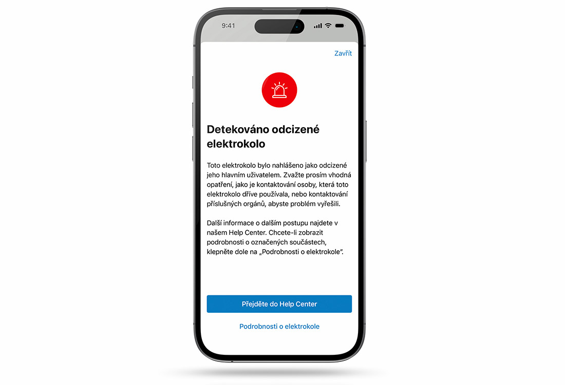 - Notifikace – pokud se někdo pokusí přihlásit kolo do aplikace eBike Flow, okamžitě dostane varování, že je kolo kradené. Stejné varování se zobrazí i mechanikům v servise, pokud by se toto kolo připojilo na diagnostiku.