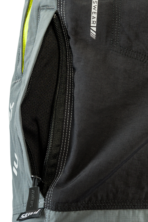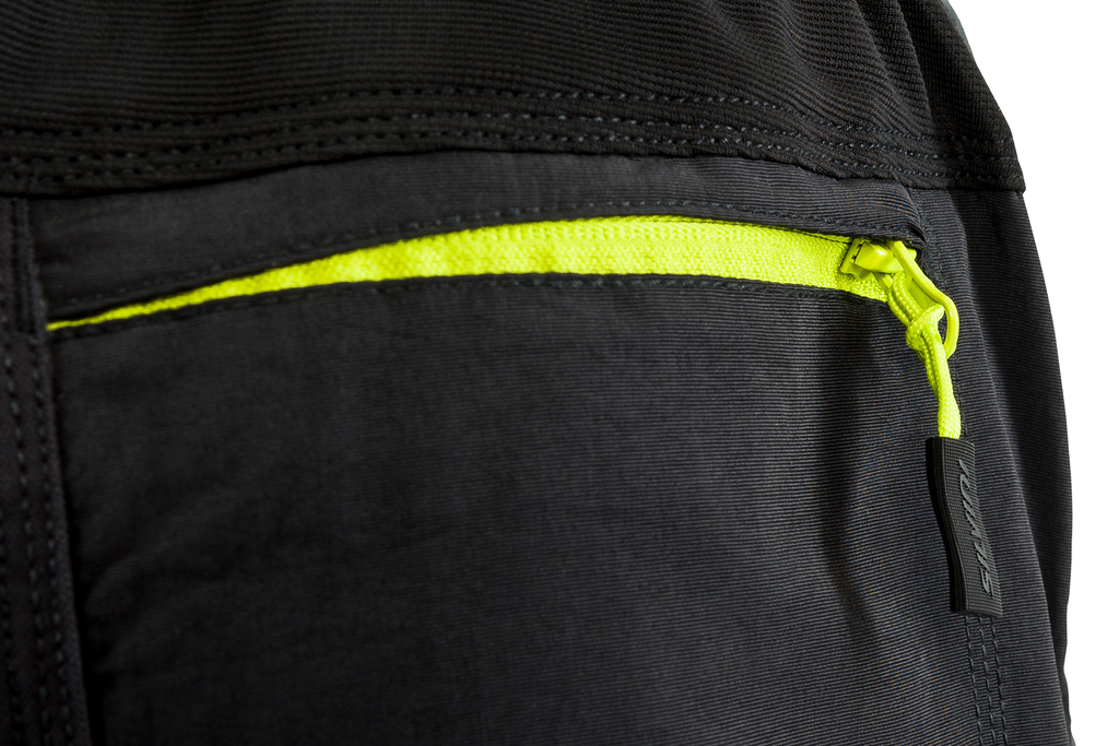 Kalhoty mají dvě boční kapsy na zip a dvě kapsy na zip na zadním díle, dále odvětrání, reflexní prvky.