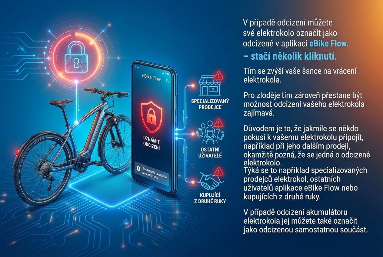 - Nahlášení - jakmile zjistíte, že vaše elektrokolo bylo odcizeno, stačí se přihlásit do aplikace eBike Flow a označit kolo jako ukradené. Systém digitálně označení kolo nebo baterii jako ukradené a tím se stane kolo pro zloděje nezajímavé.